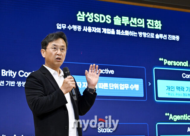 [마이데일리 = 송일섭 기자] 26일 오전 서울 잠실 삼성SDS 잠실캠퍼스에서 진해된 '삼성SDS 생성형AI 미디어데이' 행사에서 솔루션사업부장 송해구 부사장이 이야기를 하고 있다.