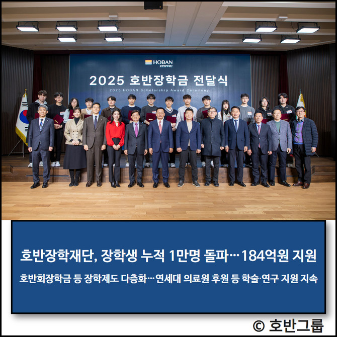 호반그룹 산하 호반장학재단은 지난 1999년 설립 이후 장학생 누적 지원 규모가 1만명을 돌파했다고 5일 밝혔다. 같은 기간 누적 장학금 규모는 총 184억원으로, 재단은 미래 인재 육성과 교육 기회 확대를 위한 사회공헌 활동을 지속해 왔다.