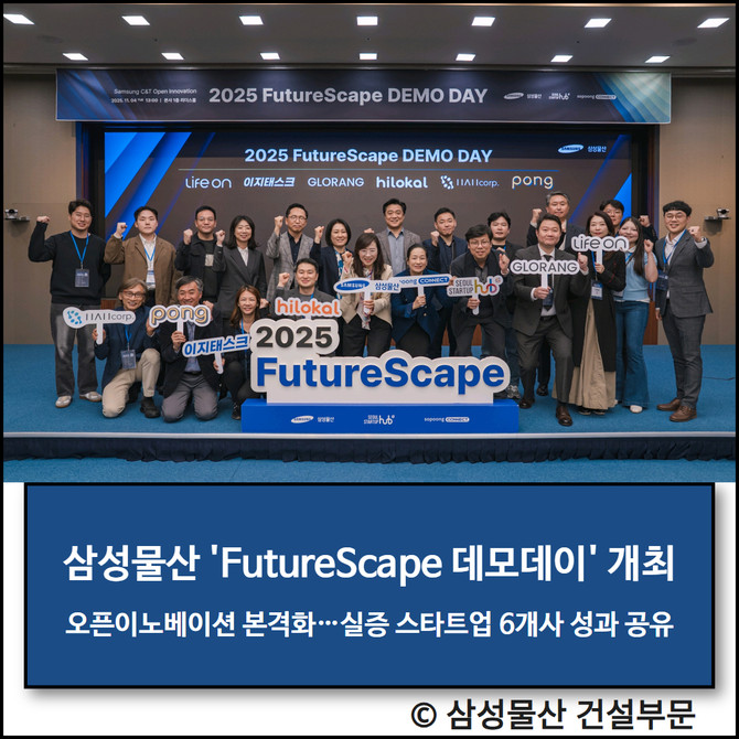 삼성물산 건설부문(이하 삼성물산)은 혁신 스타트업과의 공동 실증을 통해 신성장 동력 발굴을 가속화하고 있다고 5일 밝혔다. 삼성물산은 전날 서울 강동구 본사에서 오픈이노베이션 프로그램 '2025 FutureScape 데모데이'를 개최하고, 올해 실증 트랙에 선정된 스타트업 6개사의 사업 모델 실증 결과를 공유했다.