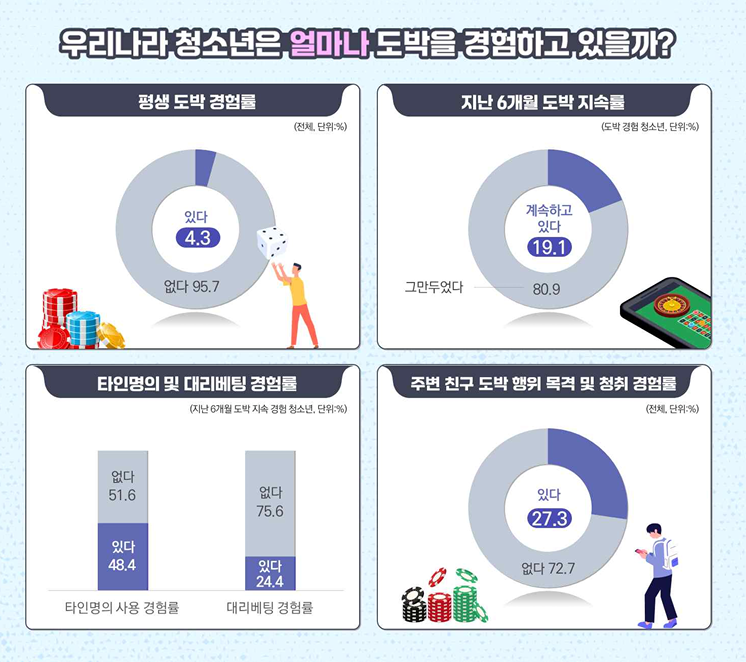 조사에 따르면 초4~고3 청소년 중 4.3%는 평생 한 번 이상 도박을 경험한 적이 있으며 27.3%는 주변 친구의 도박 행위를 목격하거나 청취한 적이 있다고 답했다. 남학생의 경험률은 5.8%로 여학생(2.6%)보다 훨씬 높게 나타났으며 교급이 올라갈수록 도박 경험률과 도박 행위 목격 및 청취 경험률도 상승했다. 도박을 경험해 본 학생들 중 지난 6개월간 지속적으로 도박을 경험한 청소년은 19.1%로 나타났으며 그중 48.4%는 타인 명의를 사용했고 24.4%는 대리 베팅을 했다고 응답했다.