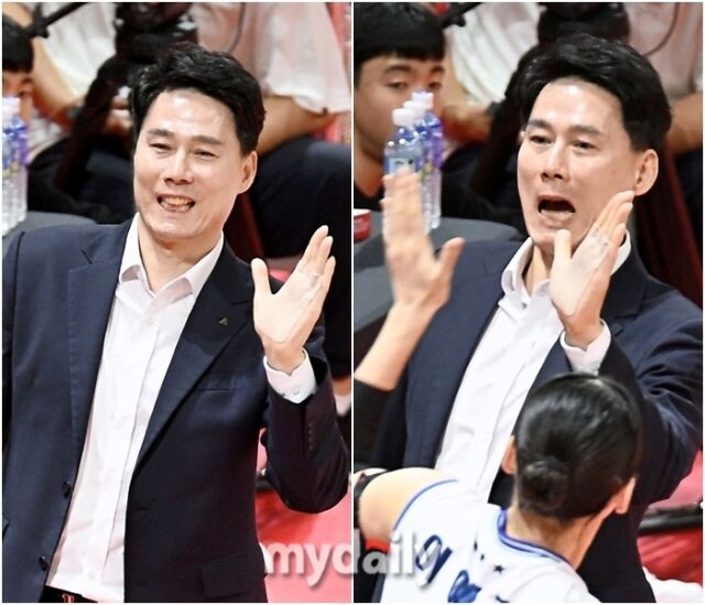 [마이데일리 = 광주 송일섭 기자] 현대건설 강성형 감독이 30일 오후 광주광역시 염주체육관에서 진행된 '2025-2026 진에어 V리그' 페퍼저축은행과 현대건설의 경기에서 선수들과 하이파이브를 하고 있다.