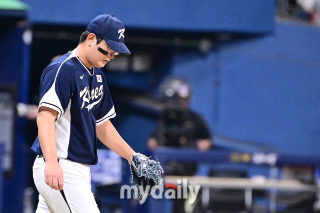 대한민국 김서현이 5회말 구원 등판해 실점을 한 뒤 고개를 숙이고 있다.