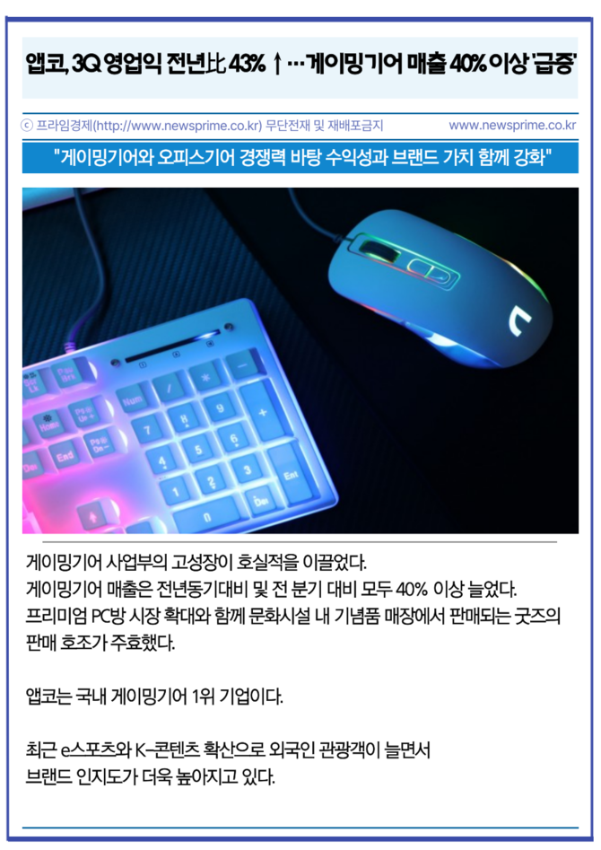 게이밍기어 사업부의 고성장이 호실적을 이끌었다. 게이밍기어 매출은 전년동기대비 및 전분기대비 모두 40% 이상 늘었다. 프리미엄 PC방 시장 확대와 함께 문화시설 내 기념품 매장에서 판매되는 굿즈의 판매 호조가 주효했다.