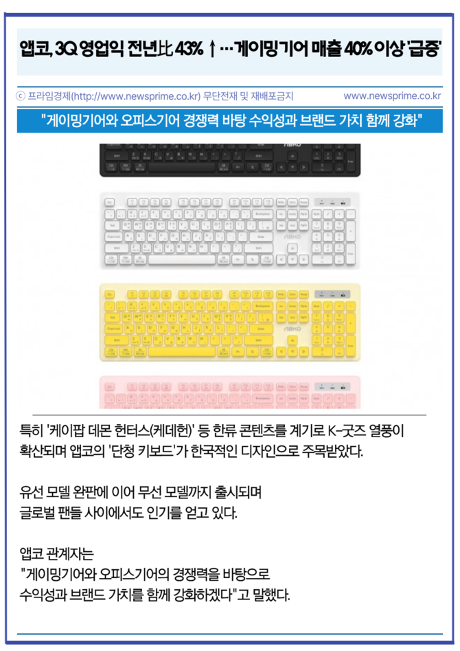[프라임경제] 게이밍기어 전문기업 앱코(129890)는 올해 3분기 연결 기준 영업이익이 전년 동기 대비 43% 늘어난 11억원을 기록했다고 13일 밝혔다. 같은 기간 매출액은 193억원, 당기순이익은 12억원이다.