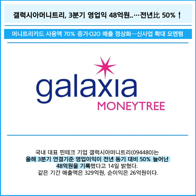 [프라임경제] 국내 대표 핀테크 기업 갤럭시아머니트리(094480)는 올해 3분기 연결기준 영업이익이 전년 동기 대비 50% 늘어난 48억원을 기록했다고 14일 밝혔다. 같은 기간 매출액은 329억원, 순이익은 26억원이다.