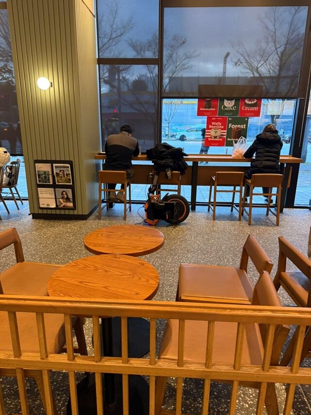 제보자가 올린 사진에는 한 남성의 것으로 추정되는 전동휠이 창가 쪽 바형 테이블에 위치한 콘센트를 통해 충전되고 있었고, 부피는 배낭가방 정도였다.