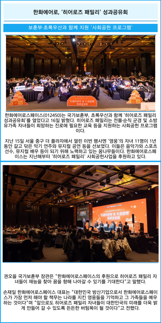 [프라임경제] 한화에어로스페이스(012450)는 국가보훈부, 초록우산과 함께 '히어로즈 패밀리 성과공유회'를 열었다고 16일 밝혔다. 히어로즈 패밀리는 전몰·순직 군경 및 소방 유가족 자녀들이 희망하는 진로에 필요한 교육 등을 지원하는 사회공헌 프로그램이다.