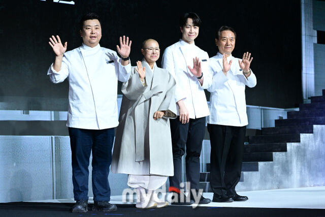 [마이데일리 = 곽경훈 기자] 17일 오전 서울 JW 메리어트 동대문 스퀘어에서 진행된 넷플릭스 '흑백요리사: 요리 계급 전쟁2' 기자간담회에서 백쉐프들이 포즈를 취하고 있다.(왼쪽부터 정효영, 선재스님, 손정원, 후덕준)