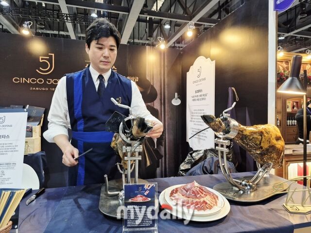 [마이데일리 = 방금숙 기자] 18일 서울 강서구 코엑스마곡에서 열린 ‘컬리푸드페스타 2025’에서 쉐프스푸드 부스 관계자가 140여년 전통의 스페인 이베리코 프리미엄 하몽을 직접 카빙해 고객에게 제공하고 있다.