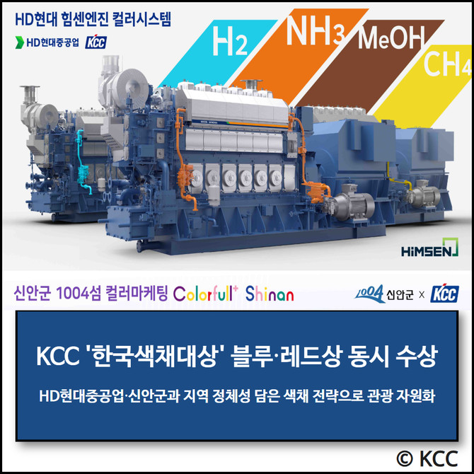 KCC는 HD현대중공업과 함께 'HD현대 힘센엔진 컬러시스템'을 출품해 블루상(기술)을 수상했다. 힘센엔진은 친환경·고성능을 대표하는 HD현대의 핵심 선박 엔진이다. 신안군과 함께 출품한 '1004 컬러마케팅'은 레드상(혁신)을 수상했다. 작품은 1004개의 섬으로 구성된 다도해 지역의 특성을 살려 각 섬에 고유한 색을 부여하고 이를 관광 자원으로 발전시켰다.