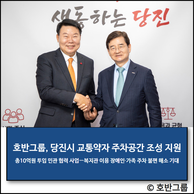 호반그룹은 충청남도 당진시 '교통약자 주차공간 조성 사업'을 지원한다고 18일 밝혔다. 이날 김선규 호반그룹 회장과 오성환 당진시장은 지원 방안에 대해 논의했다.