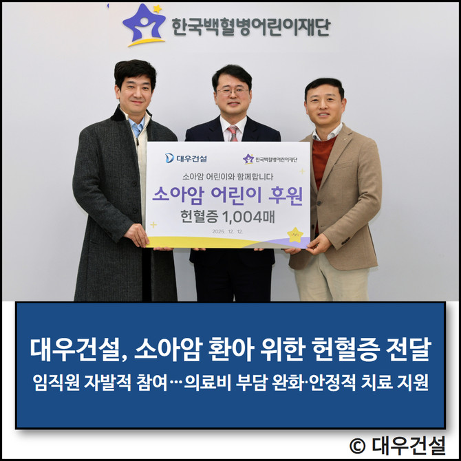 대우건설이 전달한 헌혈증 1004매는 임직원들이 자발적으로 참여해 모은 것이다. 헌혈증은 치료 과정에서 다량의 혈액 수혈이 필요한 소아암 환아들의 의료비 부담을 줄이고, 적시에 안정적인 치료를 받을 수 있도록 돕는 데 사용될 예정이다.