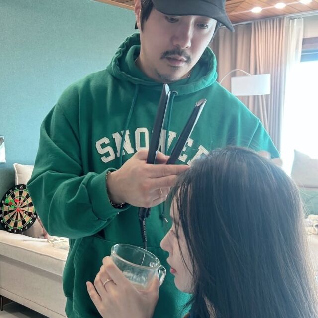 공개된 사진 속에는 의자에 앉아 있는 아내의 머리를 직접 손질해주는 KCM의 모습이 담겼다. KCM은 매직기를 들고 아내의 헤어 스타일링을 정성스럽게 도와주며 '현실 사랑꾼' 남편의 면모를 드러냈다. 무대 위 카리스마 넘치는 모습과는 또 다른, 가정적인 매력이 눈길을 끌었다.