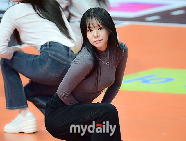 4일 부산 강서실내체육관에서 열린 진에어 2025~2026 V-리그 남자부 OK저축은행-KB손해보험 경기에 치어리더 강지유가 사복을 입고 리허설을 진행했다.