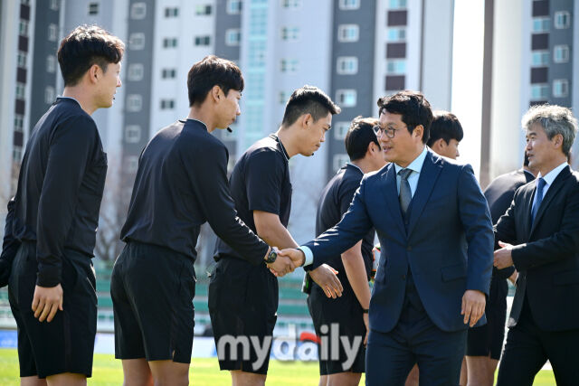 경기 전 박한동 한국대학축구연맹 회장이 주부심을 격려하고 있다.