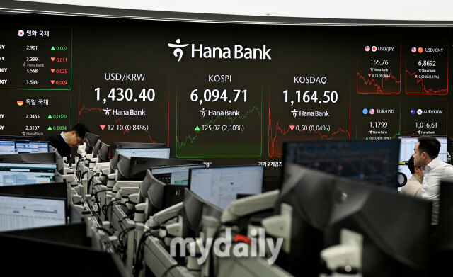 [마이데일리 = 송일섭 기자] 코스피(KOSPI)가 사상 처음으로 6000을 넘어선 25일 서울 중구 하나은행본점 딜링룸에 주가지수 현황이 표시되고 있다.