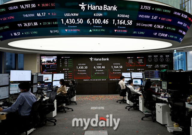 [마이데일리 = 송일섭 기자] 코스피(KOSPI)가 사상 처음으로 6000을 넘어선 25일 서울 중구 하나은행본점 딜링룸에 주가지수 현황이 표시되고 있다.