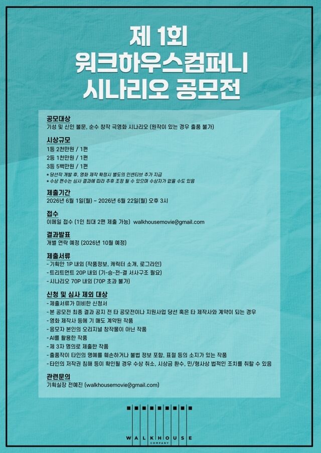 이번 공모전의 참가 접수는 6월 1일부터 22일까지며 공모 대상은 기성 및 신인 불문, 순수 창작 극영화 시나리오다. 공모전을 위해 구성된 전문가들과 워크하우스컴퍼니의 심사를 거친 수상작은 오는 10월 발표된다.