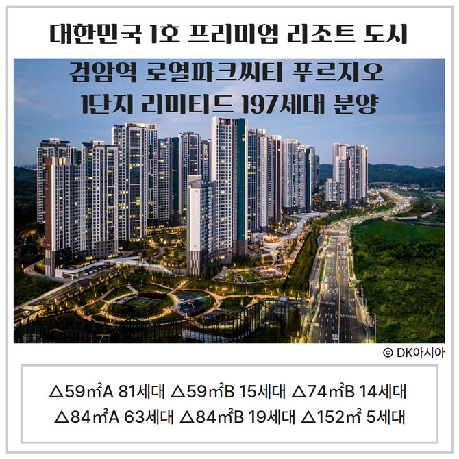 [프라임경제] DK아시아는 검암역 로열파크씨티 푸르지오 1단지(2379세대) 리미티드 197세대를 분양한다고 9일 밝혔다.