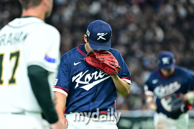 소형준이 5회말 호주 첫 타자 그렌디닝에게 솔로포를 내줬다. 이닝을 마치고 고개를 숙인 소형준.