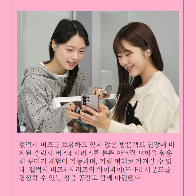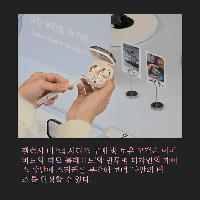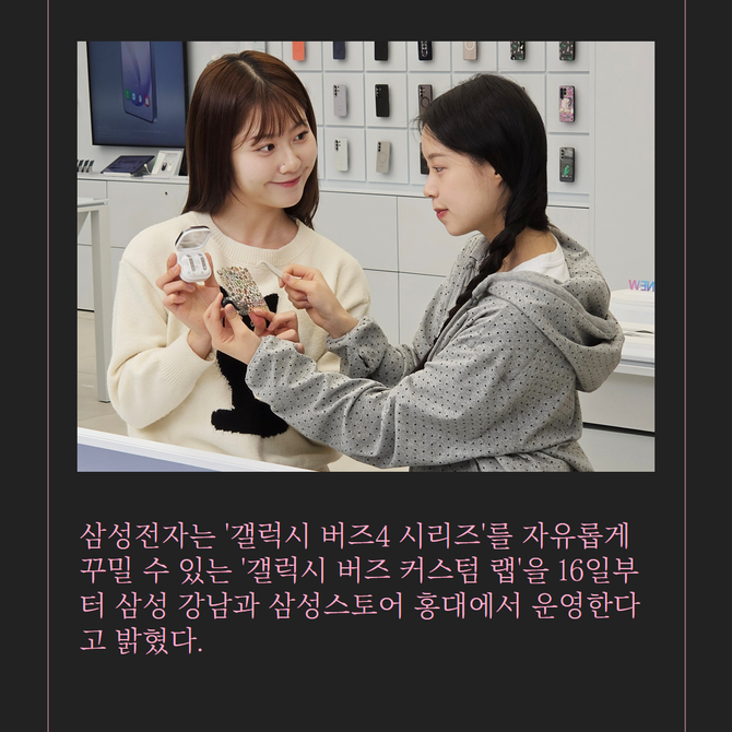 [프라임경제] 삼성전자(005930)는 '갤럭시 버즈4 시리즈'를 자유롭게 꾸며볼 수 있는 '갤럭시 버즈 커스텀 랩'을 16일부터 삼성 강남과 삼성스토어 홍대에서 운영한다고 밝혔다.