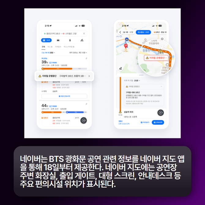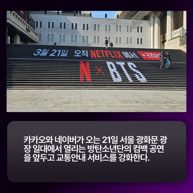 [프라임경제] 카카오(035720)와 네이버(035420)가 오는 21일 서울 광화문 광장 일대에서 열리는 방탄소년단의 컴백 공연을 앞두고 교통안내 서비스를 강화한다.