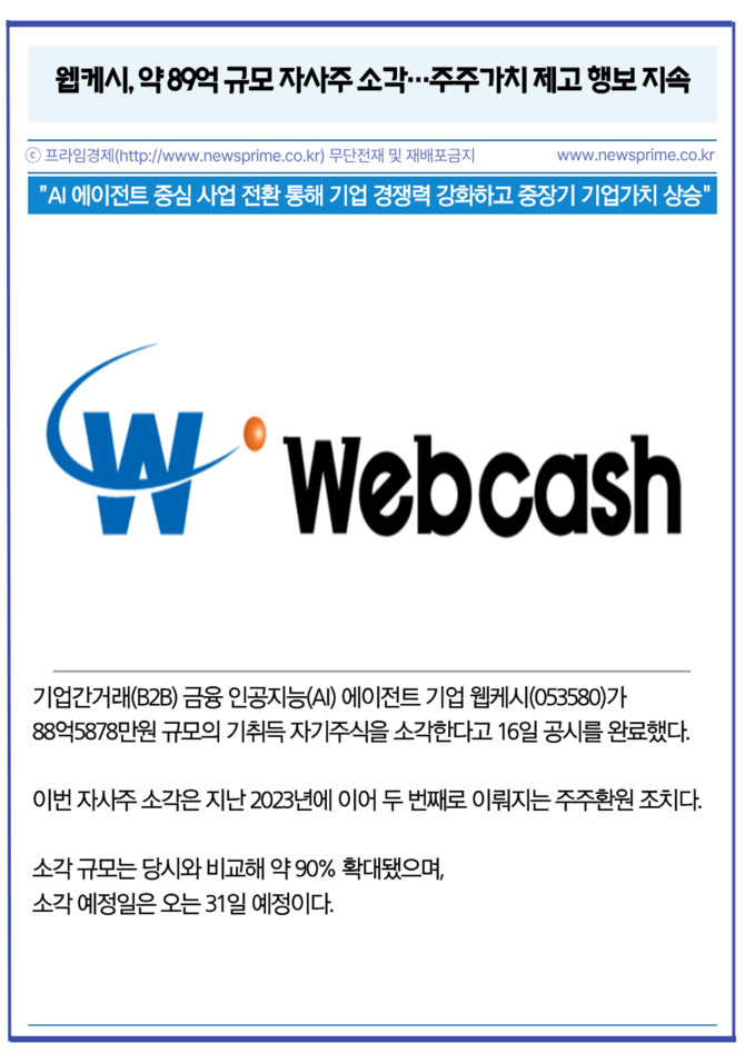 [프라임경제] 기업간거래(B2B) 금융 인공지능(AI) 에이전트 기업 웹케시(053580)가 88억5878만원 규모의 기취득 자기주식을 소각한다고 16일 공시를 완료했다.