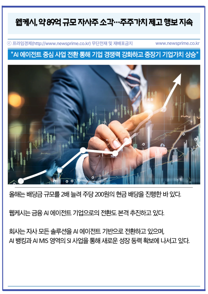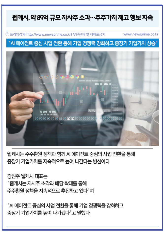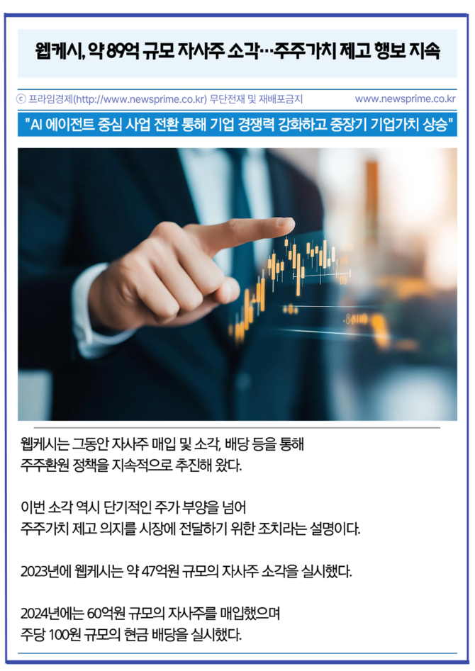 웹케시는 그동안 자사주 매입 및 소각, 배당 등을 통해 주주환원 정책을 지속적으로 추진해 왔다. 이번 소각 역시 단기적인 주가 부양을 넘어 주주가치 제고 의지를 시장에 전달하기 위한 조치라는 설명이다.