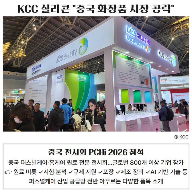 [프라임경제] KCC 실리콘이 중국 화장품 시장 공략을 위해 오는 18일부터 20일까지 현지 주요 전시회 PCHi 2026(Personal Care and Homecare Ingredients, 이하 PCHi)에 참가한다.