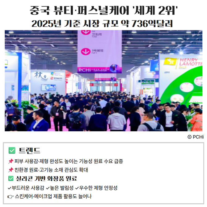 PCHi는 중국 항저우 국제컨벤션센터(Hangzhou Grand Convention and Exhibition Center)에서 개최되는 중국 최대 규모의 퍼스널케어 및 홈케어 원료 전문 전시회다. 시장조사업체에 따르면 중국 뷰티·퍼스널케어 시장 규모는 2025년 약 736억 달러로 세계 2위 수준을 기록하는 등 글로벌 화장품 기업들의 핵심 시장으로 꼽힌다.