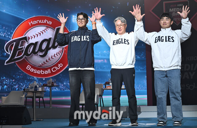 [마이데일리 = 송일섭 기자] 한화 이글스 채은성, 김경문 감독, 문현빈(왼쪽부터)이 26일 오후 서울 잠실 롯데호텔에서 진행된 '2026 신한SOL KBO 미디어데이'에서 포즈를 취하고 있다.