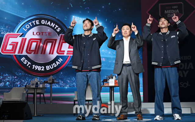 [마이데일리 = 송일섭 기자] 롯데 자이언츠 전준우, 김태형 감독, 전민재(왼쪽부터)가 26일 오후 서울 잠실 롯데호텔에서 진행된 '2026 신한SOL KBO리그 미디어데이'에서 포즈를 취하고 있다.