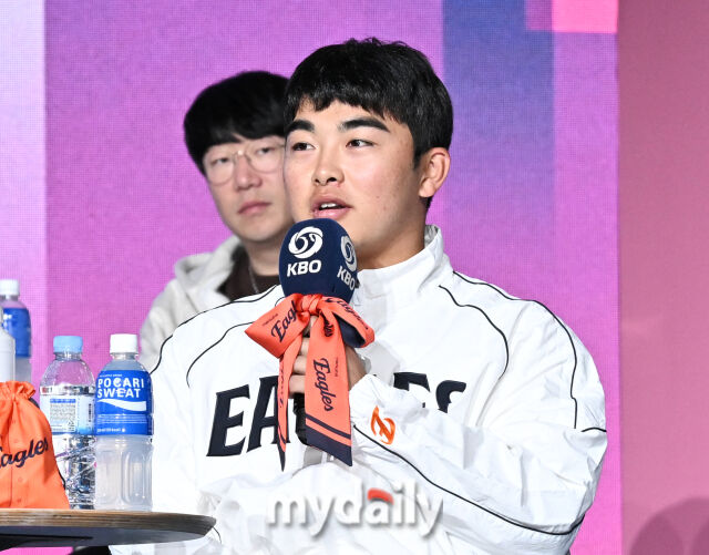 [마이데일리 = 송일섭 기자] 한화 문현빈이 26일 오후 서울 잠실 롯데호텔에서 진행된 '2026 신한SOL KBO리그 미디어데이'에서 이야기를 하고 있다.