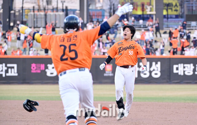 한화 강백호가 연장 11회말 끝내기 안타를 치며 10-9 승리한 뒤 기뻐하고 있다.