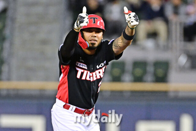 KIA 카스트로가 2회초 2사 1-3루에 2타점 적시 2루타를 친 후 기뻐하고 있다.