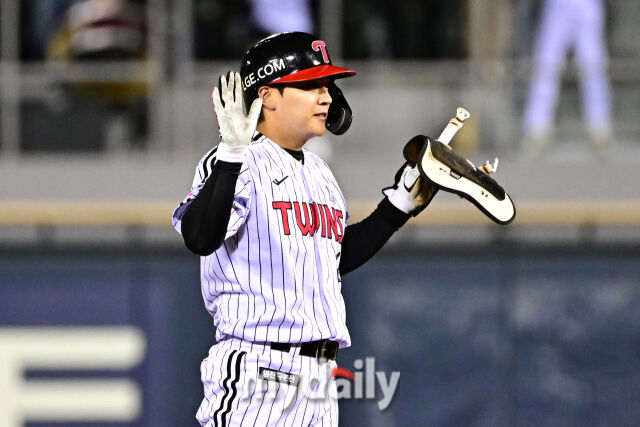 LG 최원영이 7회말 2사 1-2루에 1타점 적시 2루타를 친 후 기뻐하고 있다.