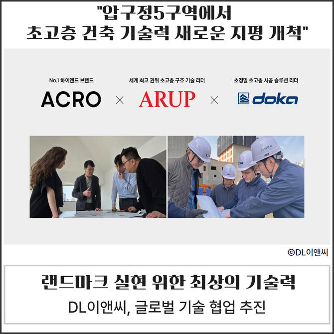 DL이앤씨에 따르면, 지난달 방한한 에이럽·도카 관계자들을 만나 초고층 건축물 설계·시공 기술에 대한 논의를 마쳤다. 각자 핵심 역량을 결집시켜 안전성과 시공 효율성을 극대화한 기술력을 압구정5구역에 적용하기로 합의했다.