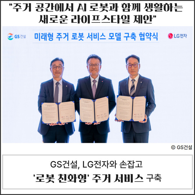 양사는 이번 협약을 통해 GS건설 자이와 LG전자 AI 홈 로봇을 결합한 미래형 주거 서비스 모델을 구축하고, 다양한 AI 기반 주거 서비스로 미래 주거 문화를 선도한다는 방침이다. 이에 따라 주거 공간 내 로봇 서비스를 제공할 수 있는 최적 시나리오를 도출하고 △로봇 동선 확보 △전용 엘리베이터 연동 △충전 인프라 구축 등 '로봇 친화형 설계기준'을 마련하고 아파트 설계 단계부터 반영할 예정이다.