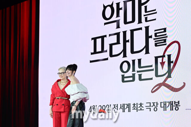 [마이데일리 = 곽경훈 기자] 8일 오전 서울 광화문 포시즌스 호텔 서울에서 진행된 '악마는 프라다를 입는다 2' 내한 기자 간담회에서 메릴 스트립과 앤 해서웨이가 포즈를 취하고 있다.