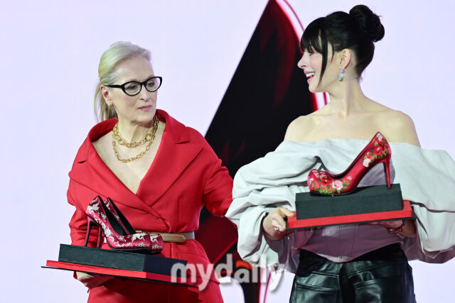 [마이데일리 = 곽경훈 기자] 8일 오전 서울 광화문 포시즌스 호텔 서울에서 진행된 '악마는 프라다를 입는다 2' 내한 기자 간담회에서 메릴 스트립이 앤 해서웨이가 꽃신을 바라보고 있다.