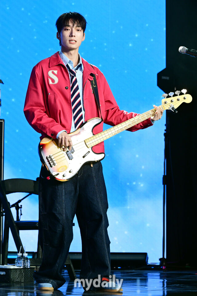 [마이데일리 = 곽경훈 기자] 8일 오후 서울 마포 문화비축기지에서 진행된 밴드 하츠웨이브 데뷔 앨범 ‘The First Wave(더 퍼스트 웨이브)’ 발매기념 쇼케이스에서 베이스 데인이 연주를 하고 있다.