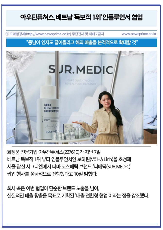 [프라임경제] 화장품 전문기업 아우딘퓨쳐스(227610)가 지난 7일 베트남 독보적 1위 뷰티 인플루언서인 보하린(Võ Hà Linh)을 초청해 서울 잠실 시그니엘에서 더마 코스메틱 브랜드 '써메딕(SUR.MEDIC)' 팝업 행사를 성공적으로 진행했다고 10일 밝혔다.