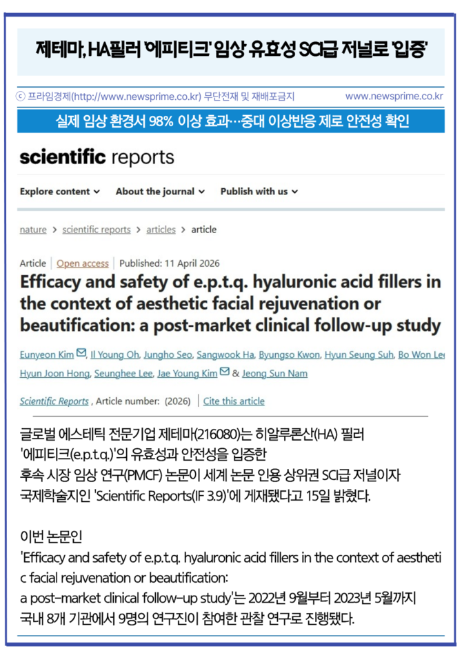 [프라임경제] 글로벌 에스테틱 전문기업 제테마(216080)는 히알루론산(HA) 필러 '에피티크(e.p.t.q.)'의 유효성과 안전성을 입증한 후속 시장 임상 연구(PMCF) 논문이 세계 논문 인용 상위권 SCI급 저널이자 국제학술지인 'Scientific Reports(IF 3.9)'에 게재됐다고 15일 밝혔다.