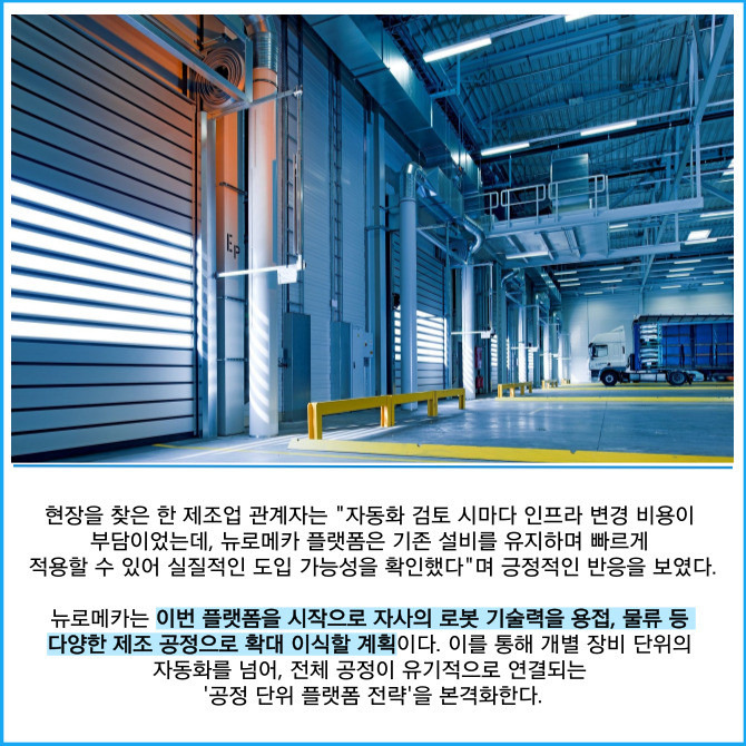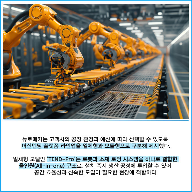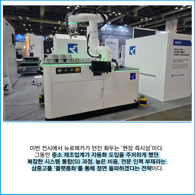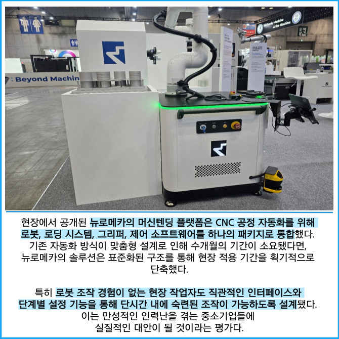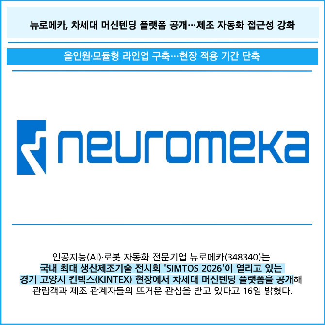 [프라임경제] 인공지능(AI)·로봇 자동화 전문기업 뉴로메카(348340)는 국내 최대 생산제조기술 전시회 'SIMTOS 2026'이 열리고 있는 경기 고양시 킨텍스(KINTEX) 현장에서 차세대 머신텐딩 플랫폼을 공개해 관람객과 제조 관계자들의 뜨거운 관심을 받고 있다고 16일 밝혔다.