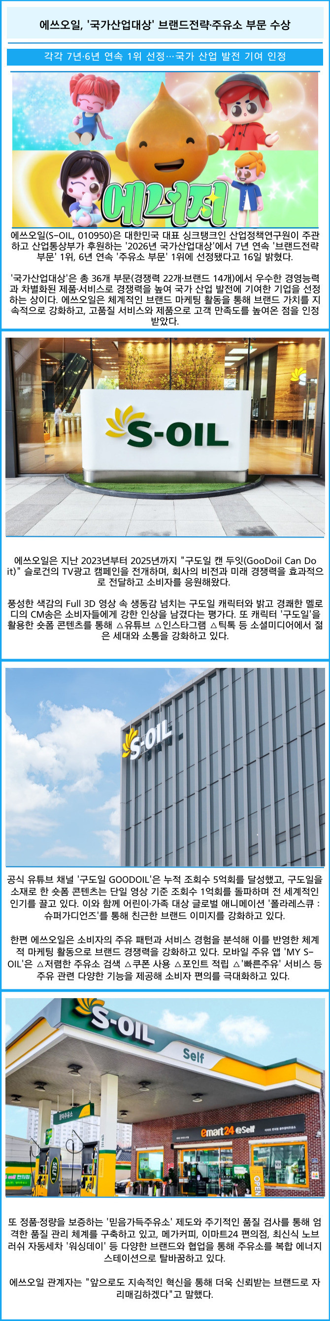 [프라임경제] 에쓰오일(S-OIL, 010950)은 대한민국 대표 싱크탱크인 산업정책연구원이 주관하고 산업통상부가 후원하는 '2026년 국가산업대상'에서 7년 연속 '브랜드전략 부문' 1위, 6년 연속 '주유소 부문' 1위에 선정됐다고 16일 밝혔다.