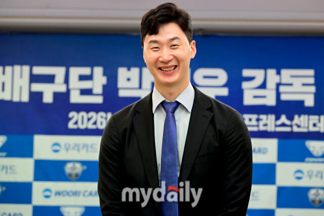 [마이데일리 = 유진형 기자] 16일 오전 서울 한국프레스센터에서 '우리카드 배구단 박철우 감독 취임 기자회견'이 열렸다. 박철우 감독이 환하게 웃고 있다.